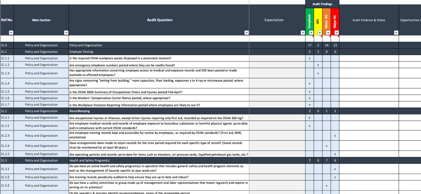 Our detailed audit templates include comprehensive questions covering all aspects of workplace safety, with structured tracking for compliance findings.