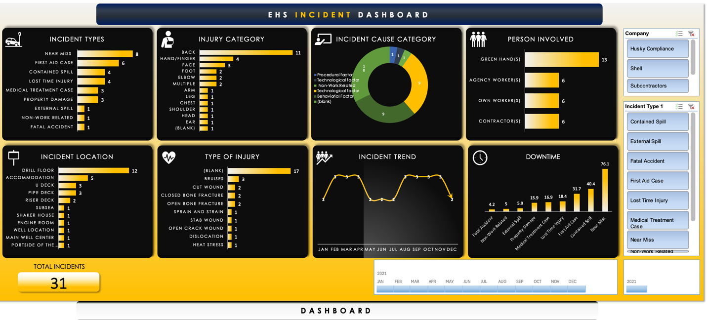 Track and analyze workplace incidents with our comprehensive EHS Incident Dashboard. Monitor incident types, injury categories, causes, locations, trends, and downtime impacts.